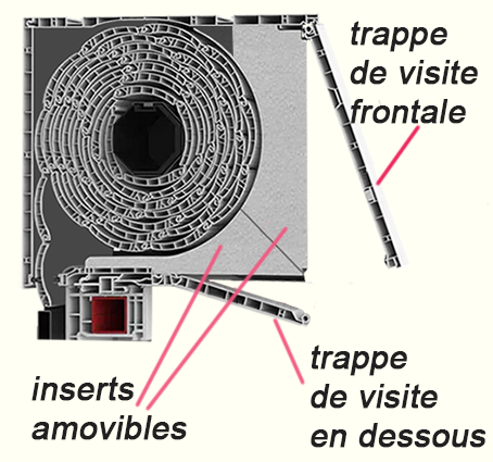 L’isolation du coffre est assurée par les inserts amovibles en polystyrène. En cas de besoin, pour accéder au tube d’enroulement et le moteur, il suffit de retirer les inserts par la trappe de visite, celle-ci pouvant être située de face ou en dessous.