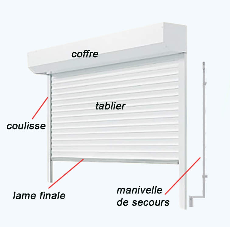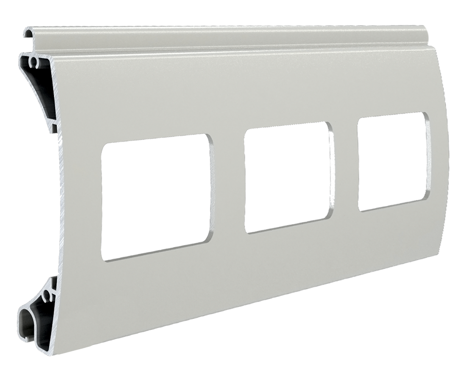 Le tablier de la porte roulante est composé de lames horizontales s’emboîtant les unes avec les autres et articulées entre elles pour pouvoir suivre la courbe de l’axe lors de l’enroulement.