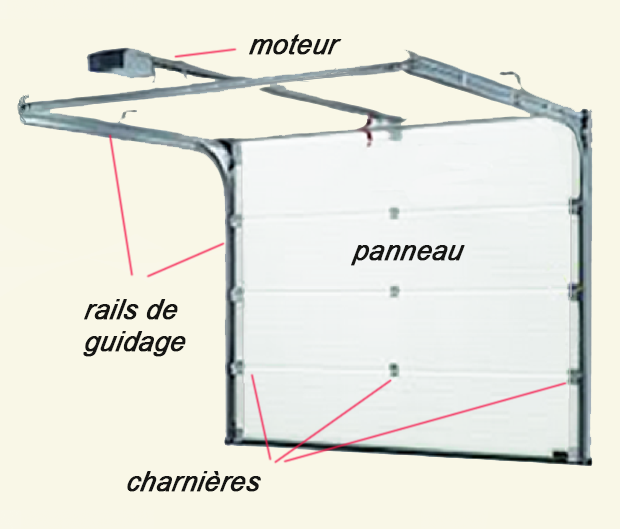Le tablier de la porte de garage sectionnelle est constitué de sections, autrement dit de segments horizontaux. Ils sont reliés entre eux par des charnières qui leur permettent de glisser tout en se pliant des rails verticaux sur les rails horizontaux, pour venir se ranger sous le plafond.