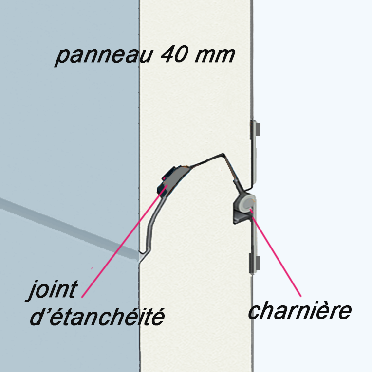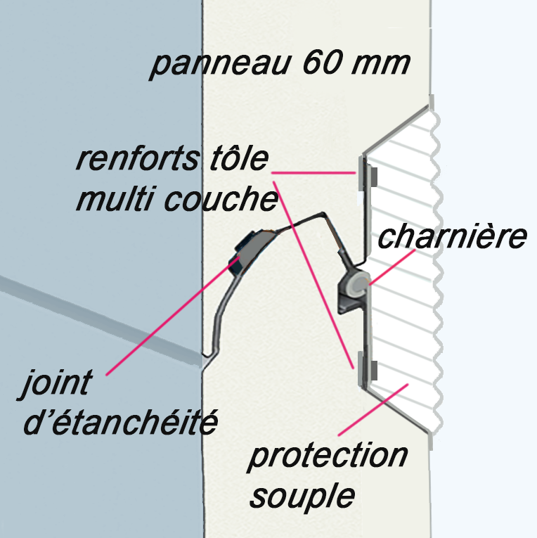 Les panneaux anti-pince doigts sont en acier double parois séparées par une couche de mousse polyuréthane sans fréon, d’épaisseur variable, en fonction du niveau d’isolation. Un joint EPDM est placé à la jonction de segments pour renforcer leur étanchéité, celle-ci étant assurée par d’autres joints à d’autres endroits de la porte.